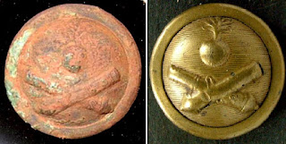 I also wanted to post a picture of the Ordnance button I recovered at a Confederate camp site on the Beauregard farm, with a non-dug example from relicman.com for comparison. The low-convex three-piece button was originally produced for a Union Ordnance Corp officer, responsible for the logistics of weapons development and procurement. The design features a flaming bomb over two crossed cannons, both of which bear the letters "US". This is a pre-war button was produced in the 1830's-40's, and a new design was used for Federal Ordnance Corp buttons in the 1850's-60's. It was found in a camp which produced several other confederate buttons, including North Carolina seal buttons and at least one Confederate Artillery "block A" button. The combination of the outdated style of the button as well as the location of the find makes it very likely that this button was re-purposed by the Confederacy for use by an artilleryman.
